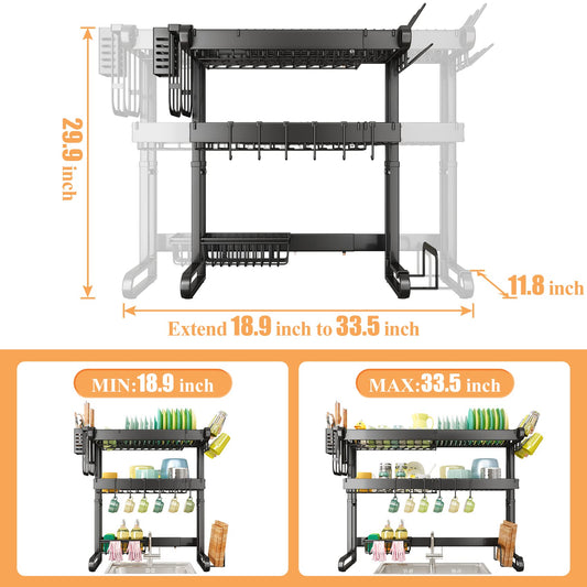 SNTD Over The Sink Dish Drainer Drying Rack, 3 Tier Adjustable (18.9" to 33.5") Kitchen Dish Rack Over Sink, Large Dish Drainer with Utensil Cup Holder