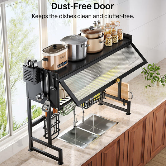 SNTD Over The Sink Dish Drying Rack, 3 Tier Adjustable (33.8 to 41.5 inch) Large Capacity Kitchen Counter Dish Drying Rack with Fruit Basket Utensil Holder Sink Caddy Cup Holder, Black